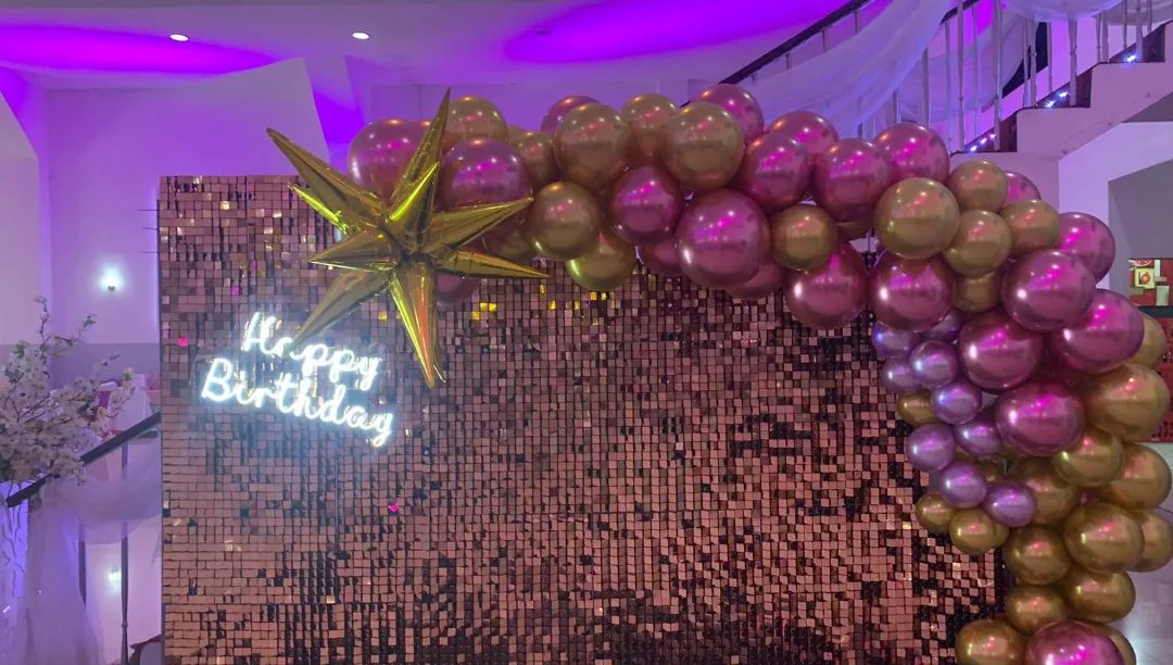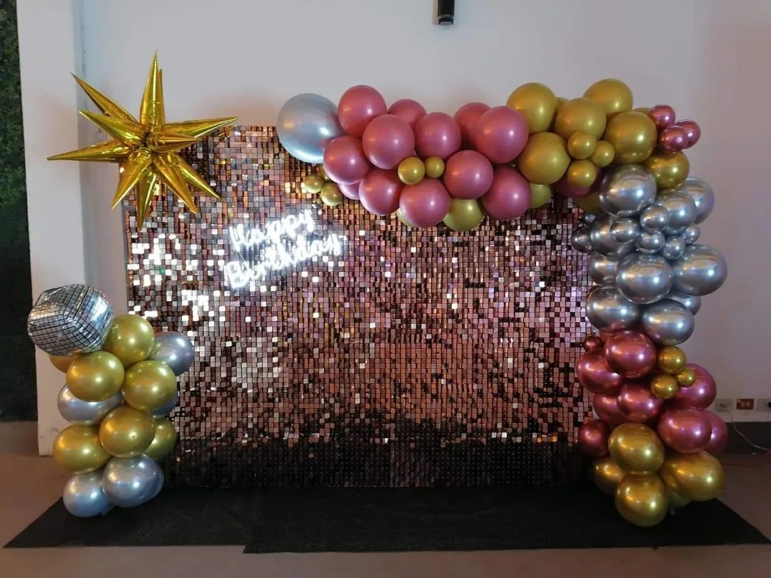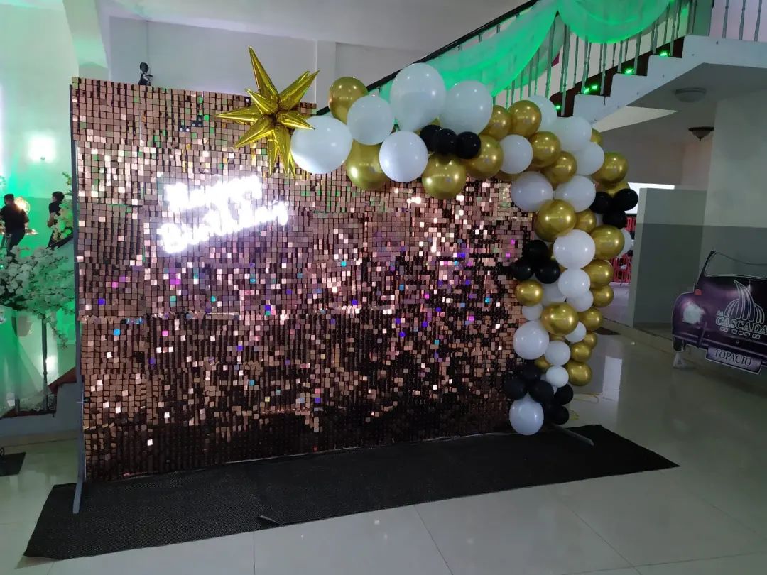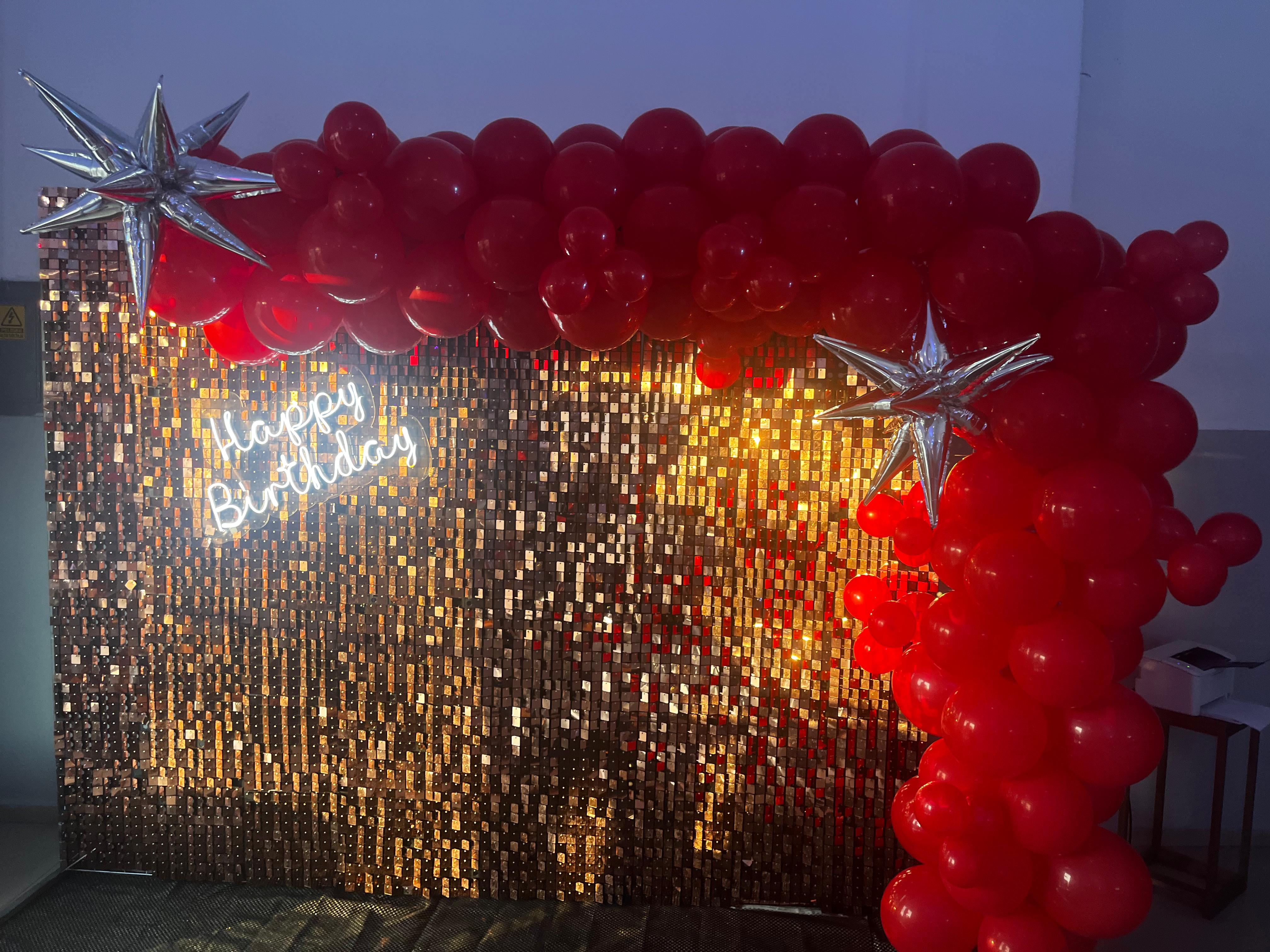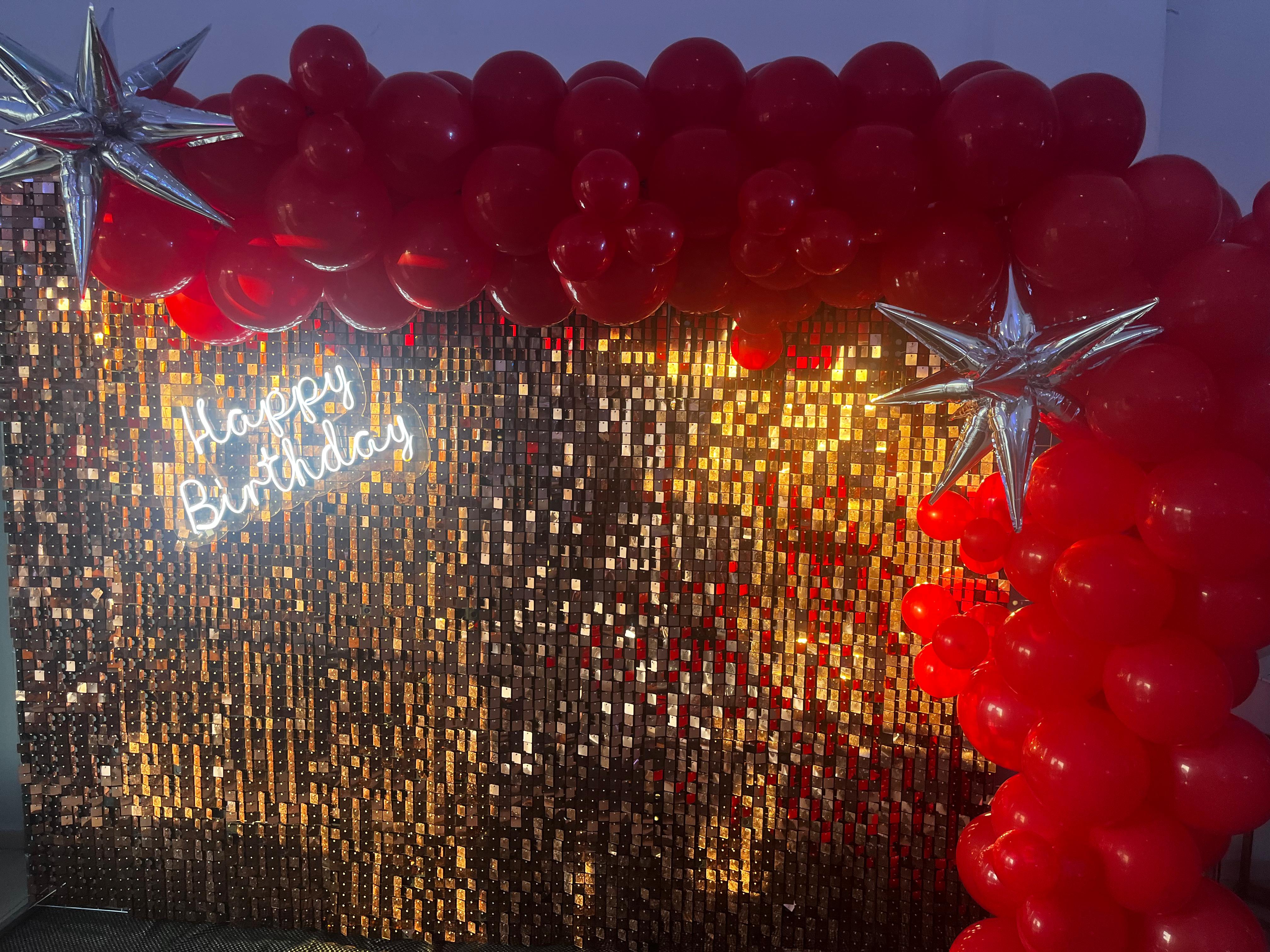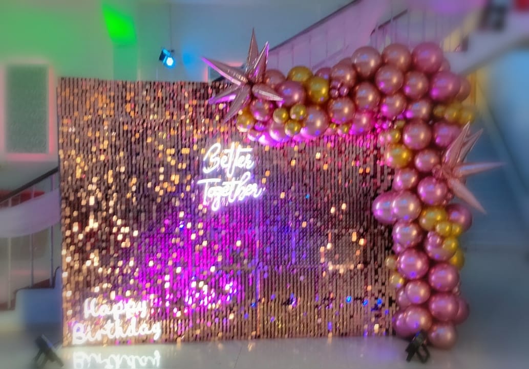 Pared con páneles metálicos, globos y letrero led.