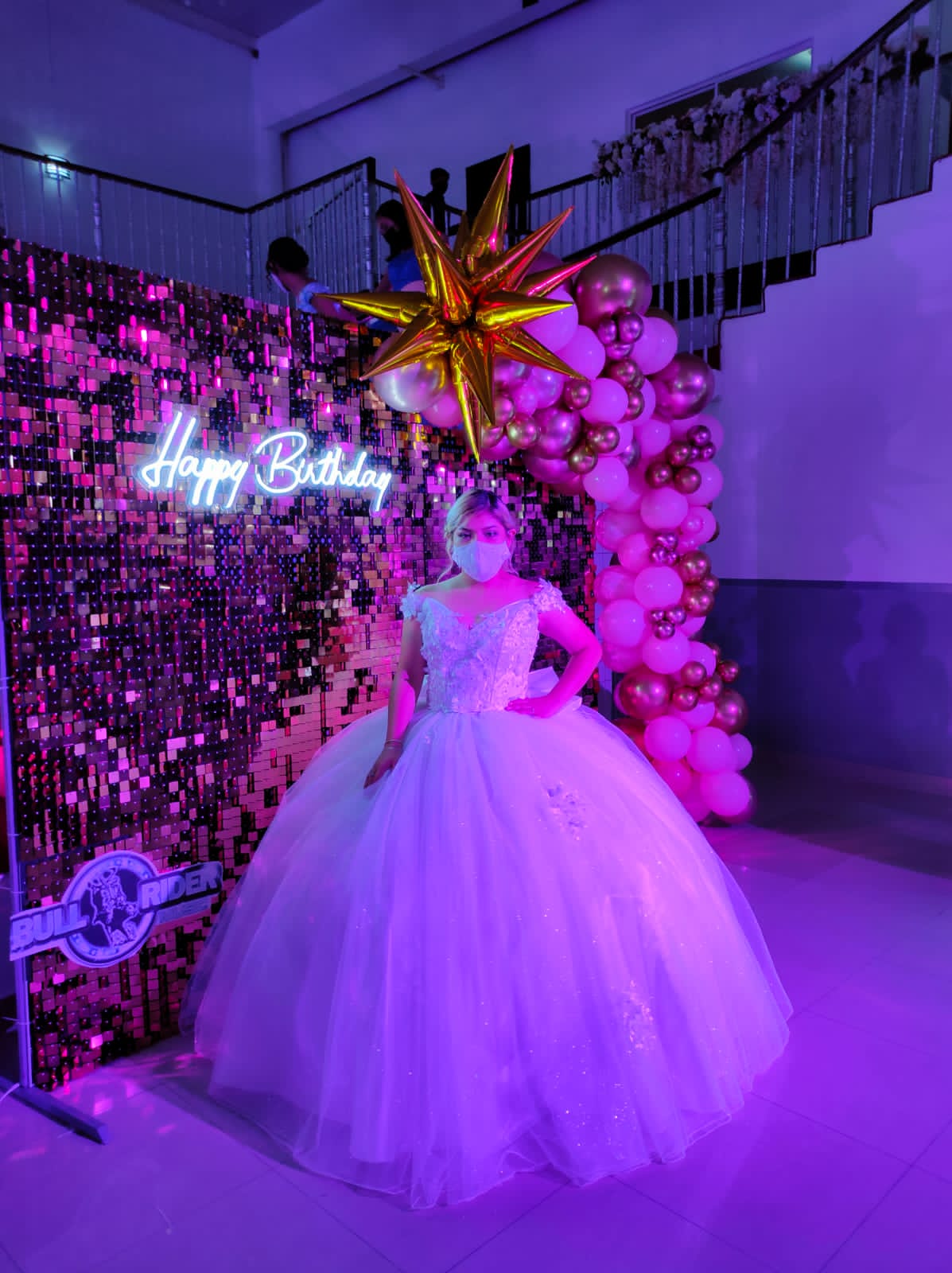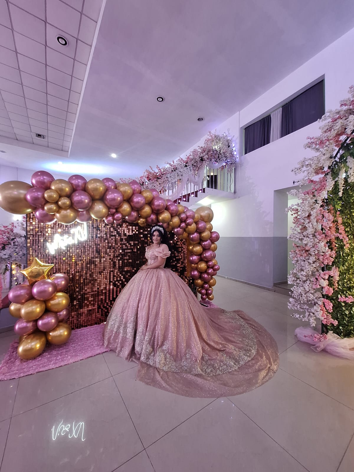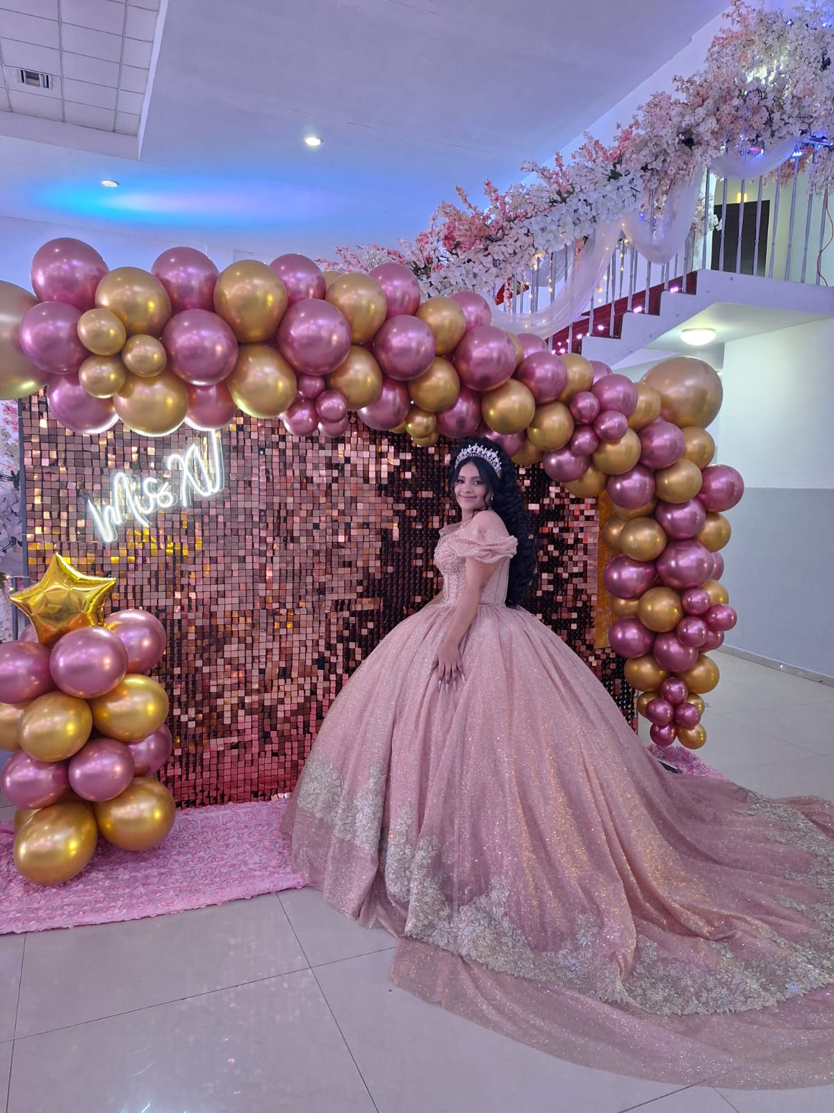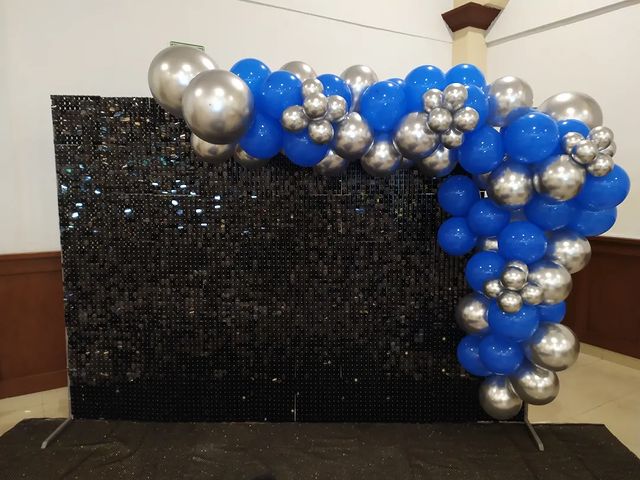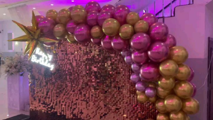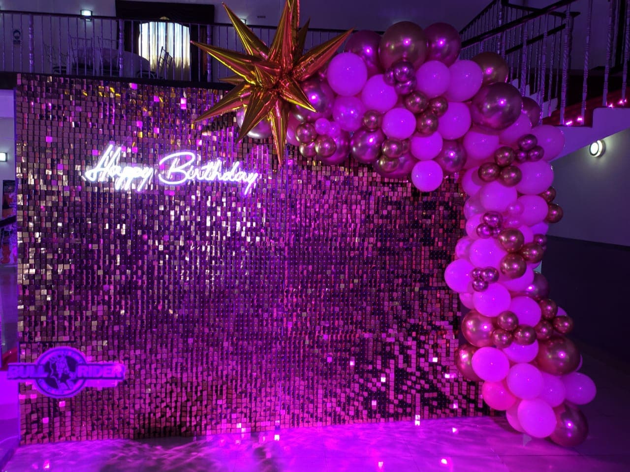 Pared con páneles metálicos, globos y letrero led.